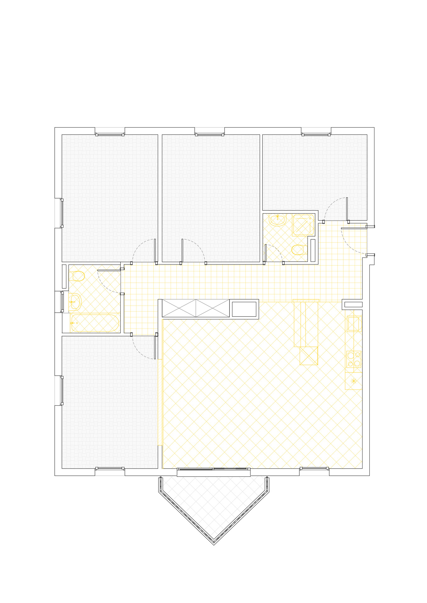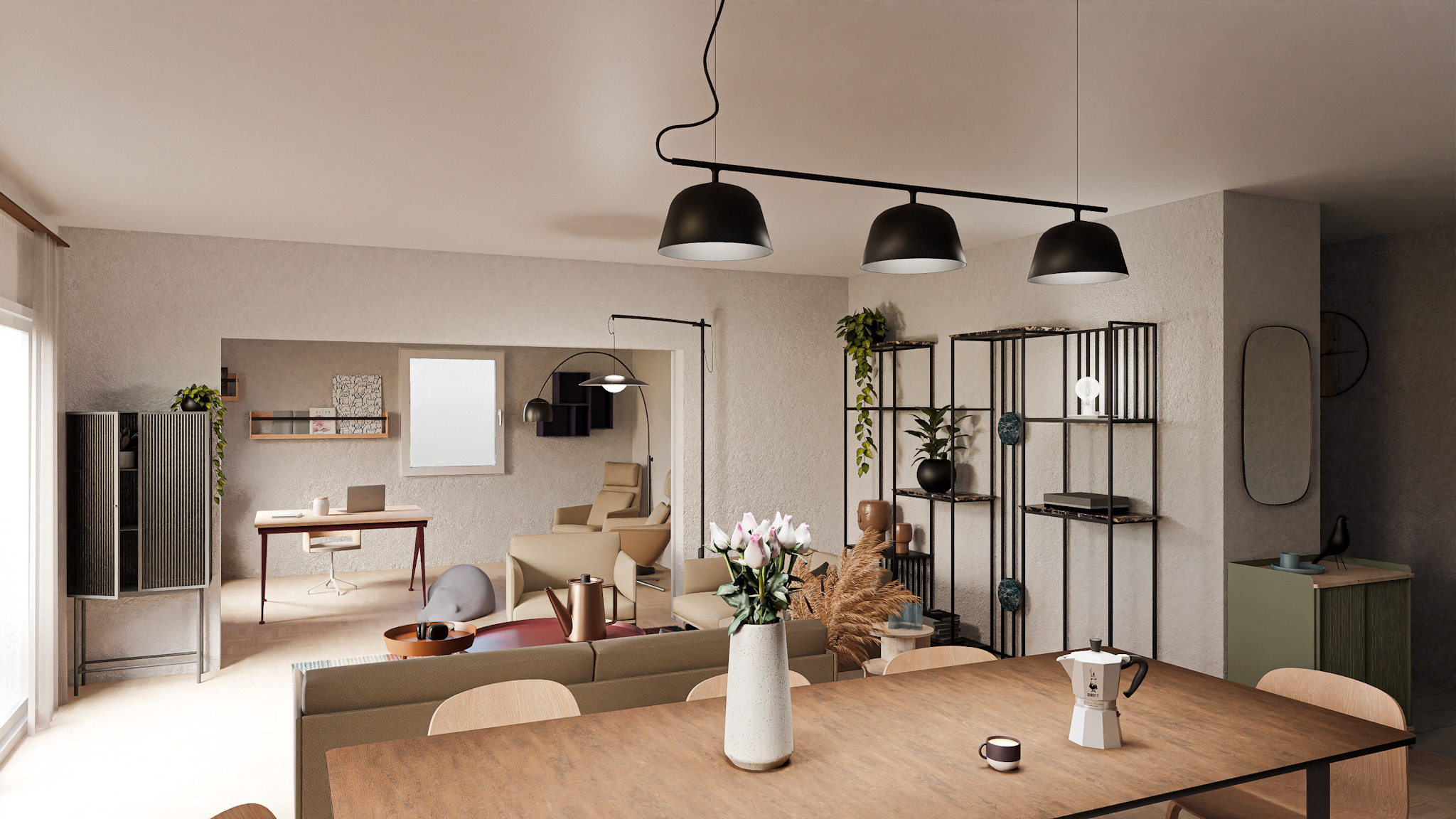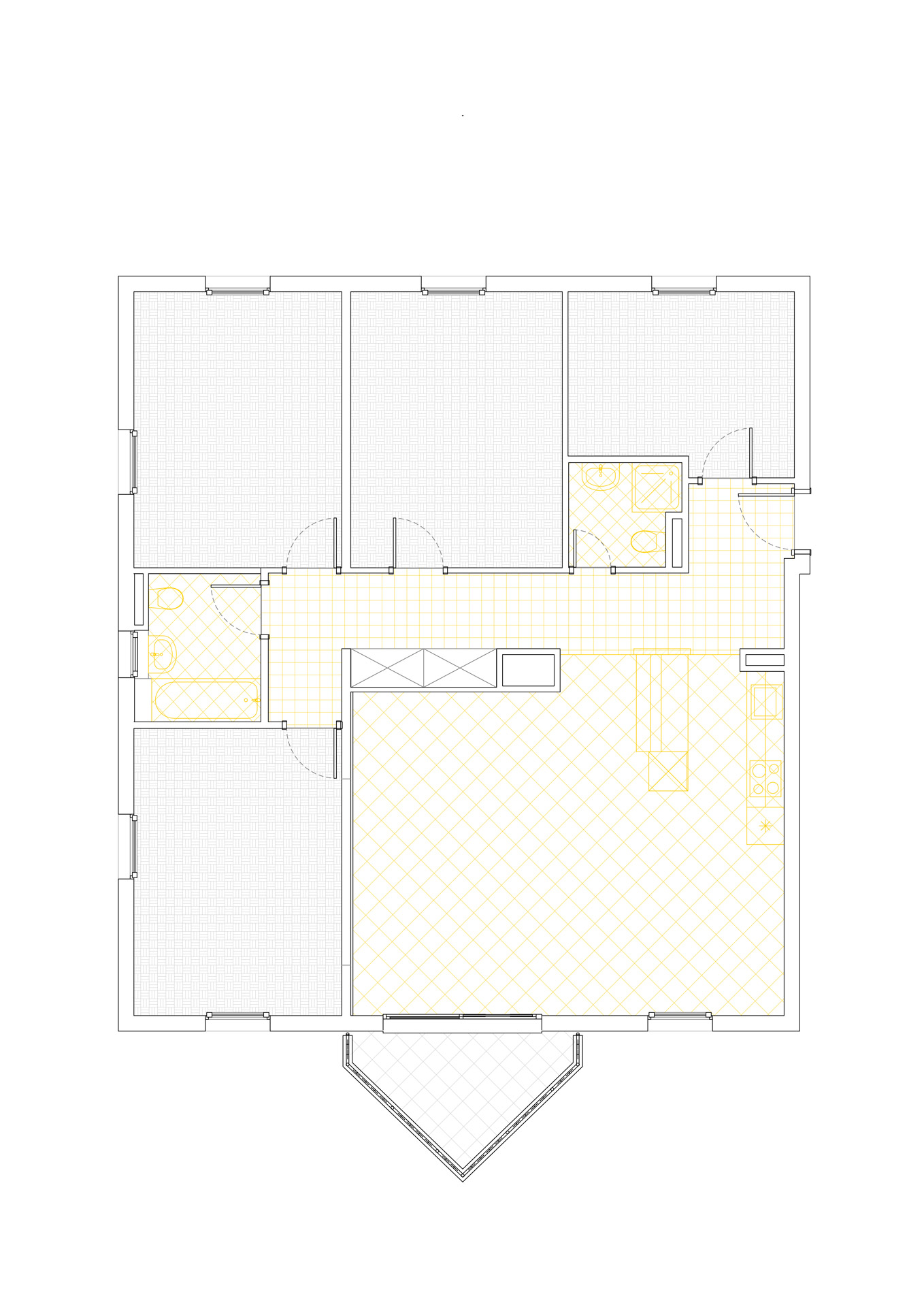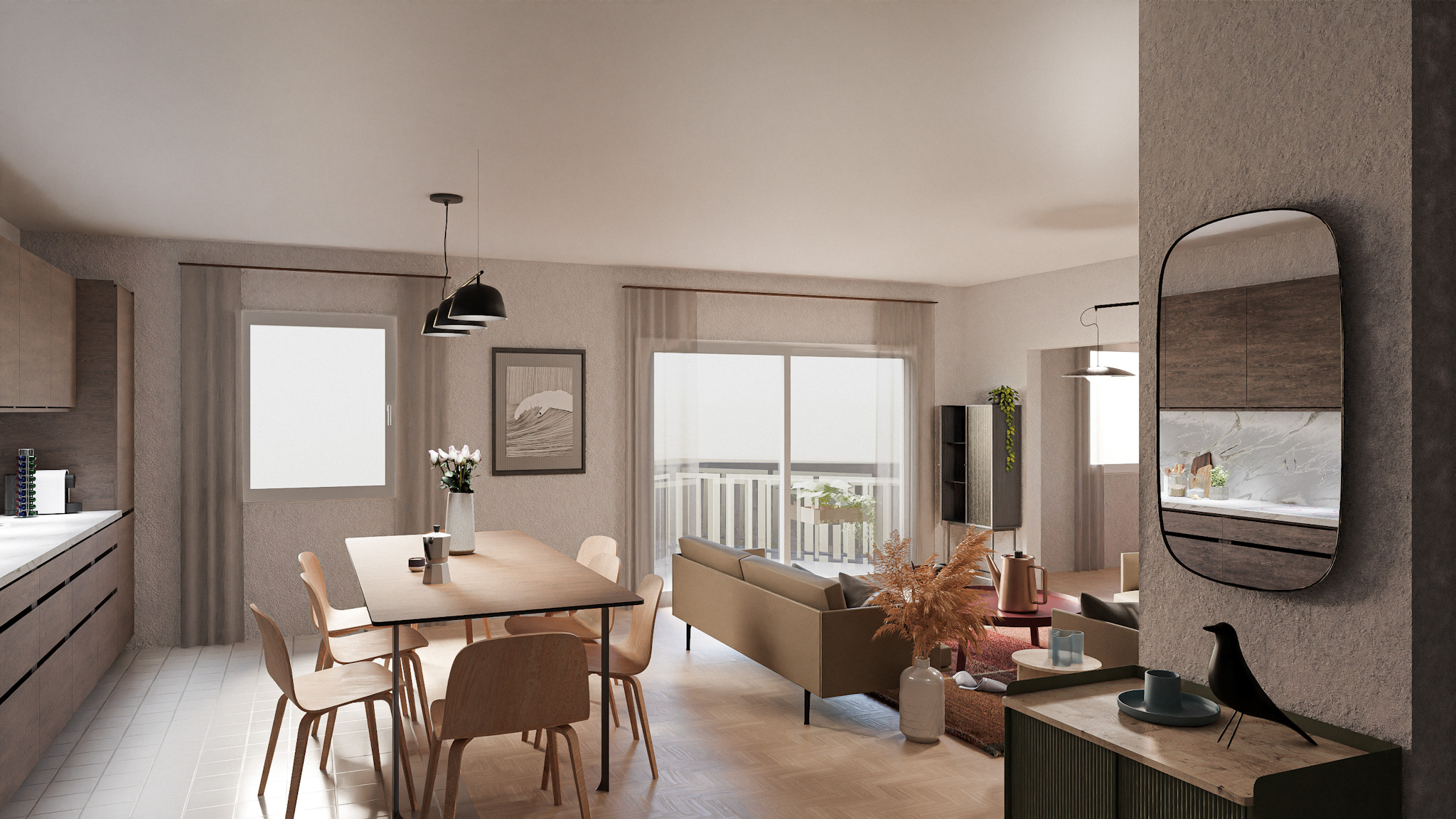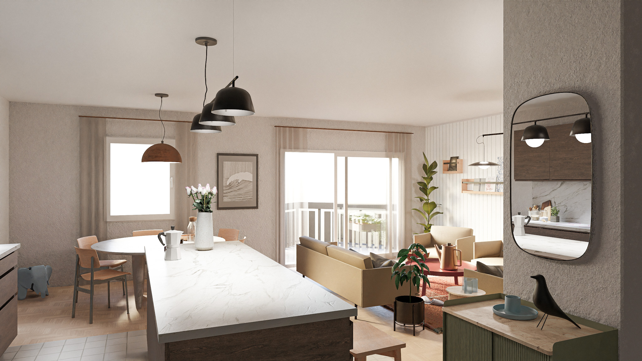 Situé au premier étage d’un immeuble datant de 1995, cet appartement de 5,5 pièces bénéficie de trois orientations et d’un balcon à l’ouest. Le projet explore deux variantes de rénovation visant à accroître son attractivité sur le marché immobilier. La variante 01 propose une ouverture de la cuisine sur l’espace de vie, une modernisation des revêtements (parquet rénové, sol différencié pour cuisine et circulation), ainsi qu’une mise à jour des salles de bains. Un travail de rafraîchissement général est prévu sur les menuiseries intérieures. La variante 02 conserve les principes de la première tout en intégrant la suppression d’une cloison non porteuse pour agrandir le séjour. Elle propose un espace polyvalent pouvant faire office de bureau, coin TV ou aire de jeux, renforçant ainsi la flexibilité et la valeur d’usage du bien.