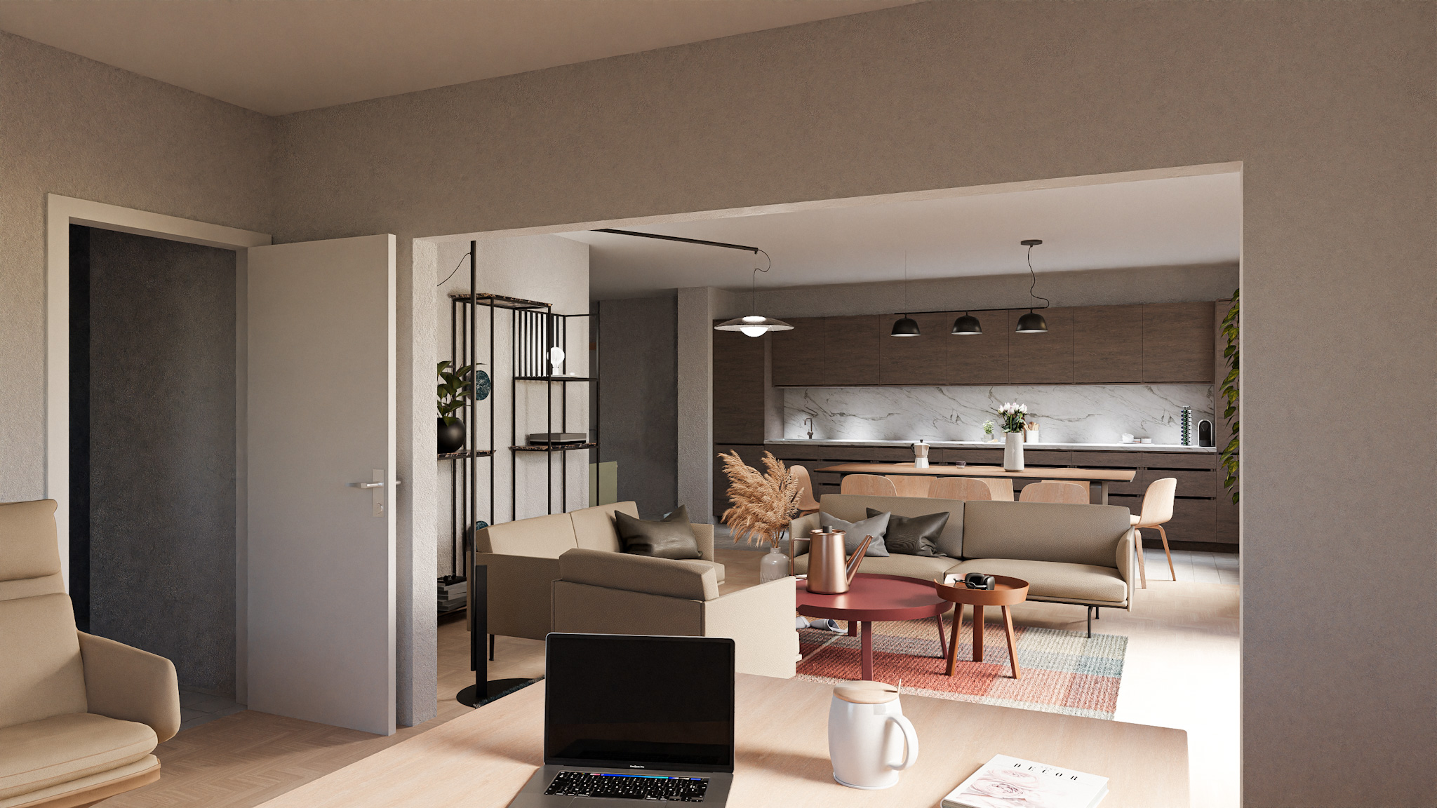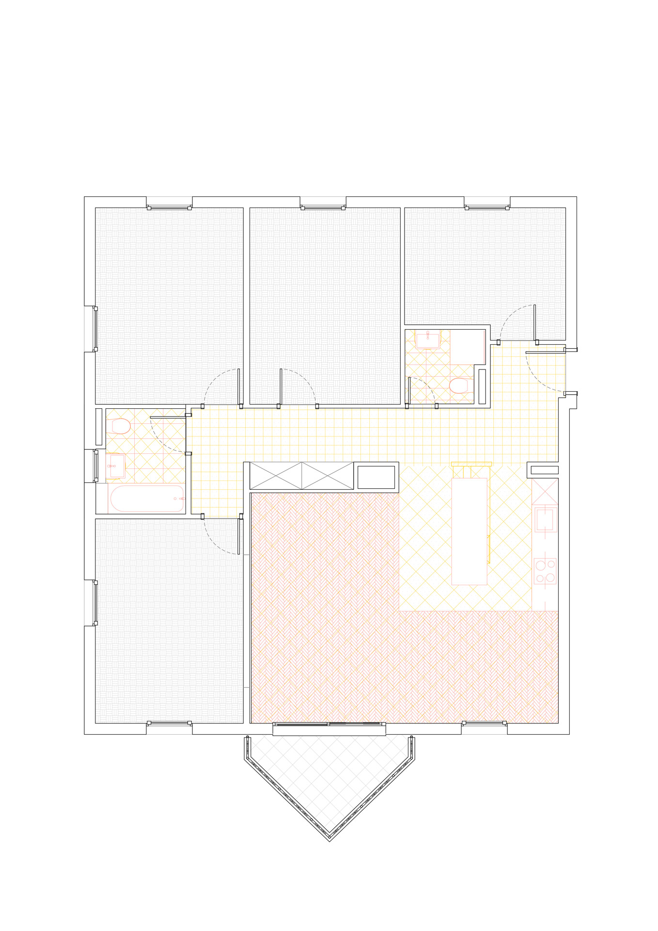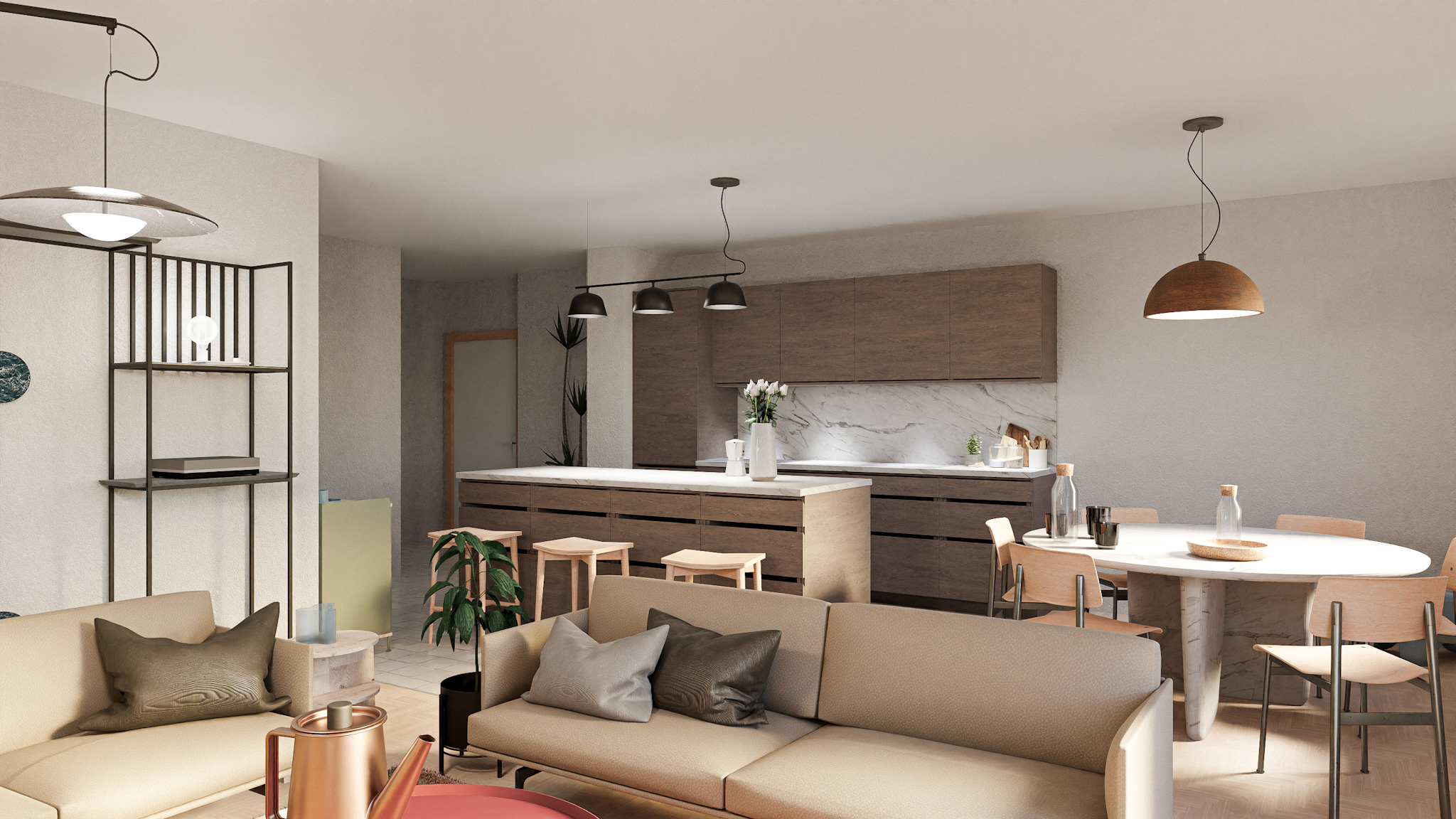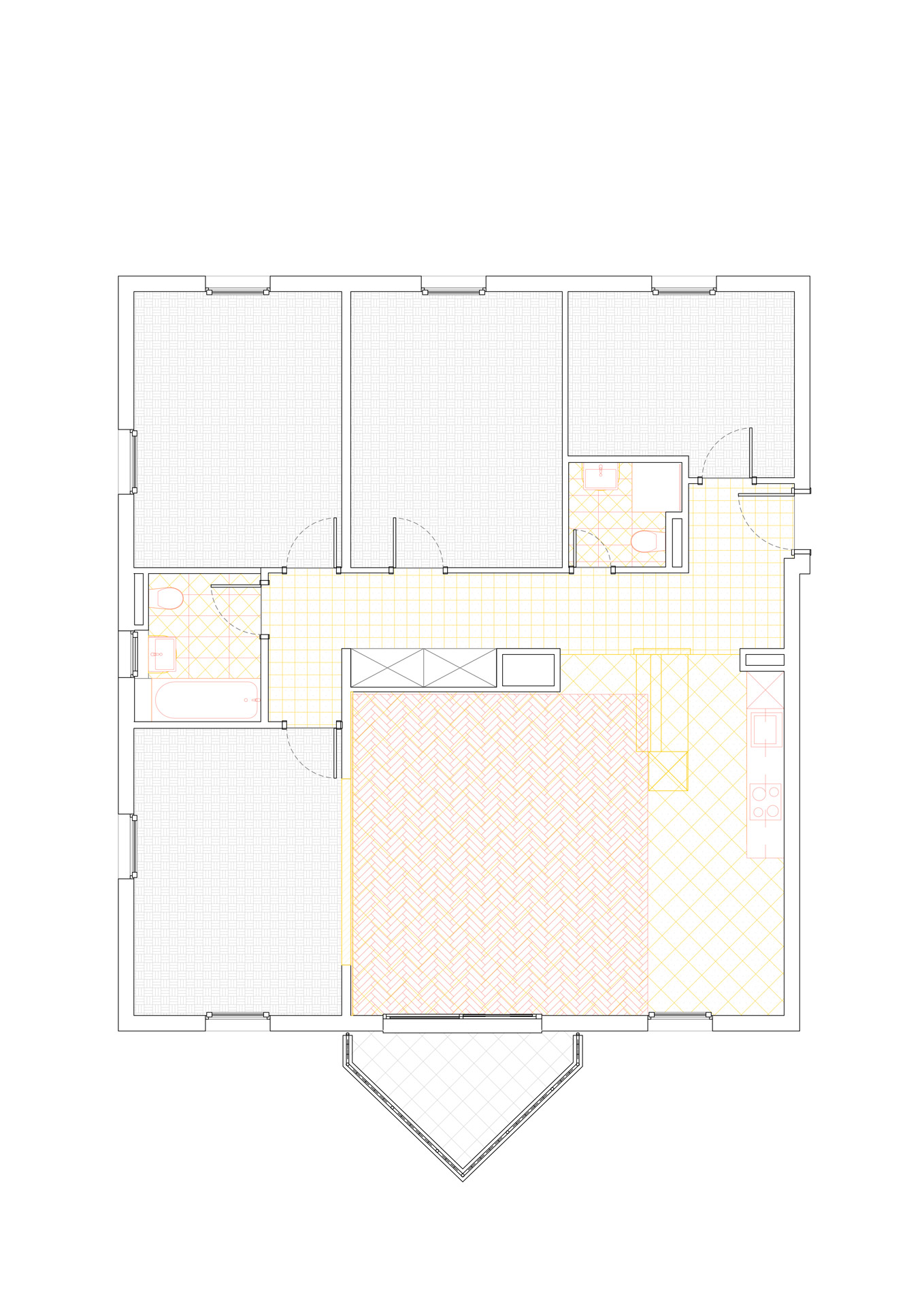 Situé au premier étage d’un immeuble datant de 1995, cet appartement de 5,5 pièces bénéficie de trois orientations et d’un balcon à l’ouest. Le projet explore deux variantes de rénovation visant à accroître son attractivité sur le marché immobilier. La variante 01 propose une ouverture de la cuisine sur l’espace de vie, une modernisation des revêtements (parquet rénové, sol différencié pour cuisine et circulation), ainsi qu’une mise à jour des salles de bains. Un travail de rafraîchissement général est prévu sur les menuiseries intérieures. La variante 02 conserve les principes de la première tout en intégrant la suppression d’une cloison non porteuse pour agrandir le séjour. Elle propose un espace polyvalent pouvant faire office de bureau, coin TV ou aire de jeux, renforçant ainsi la flexibilité et la valeur d’usage du bien.