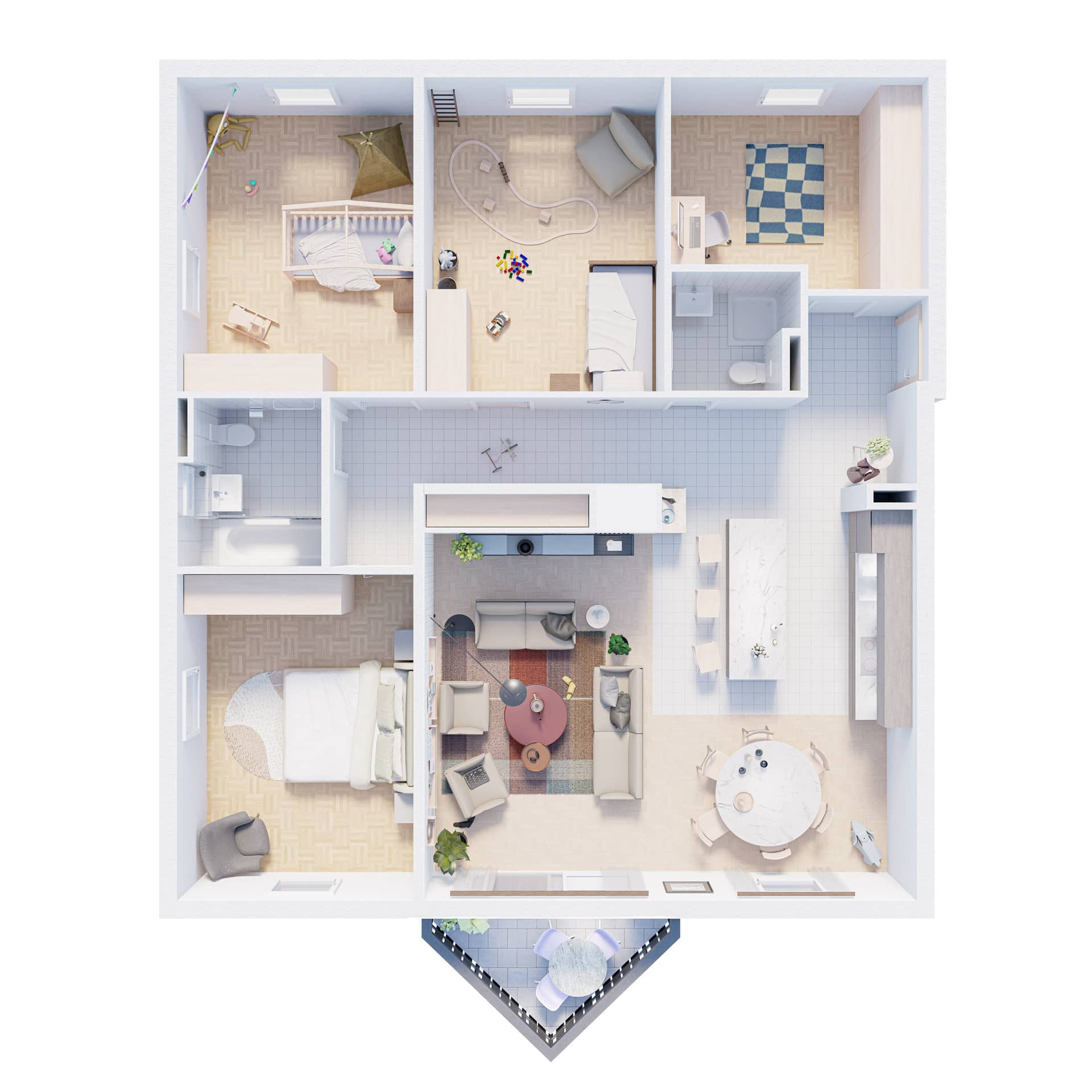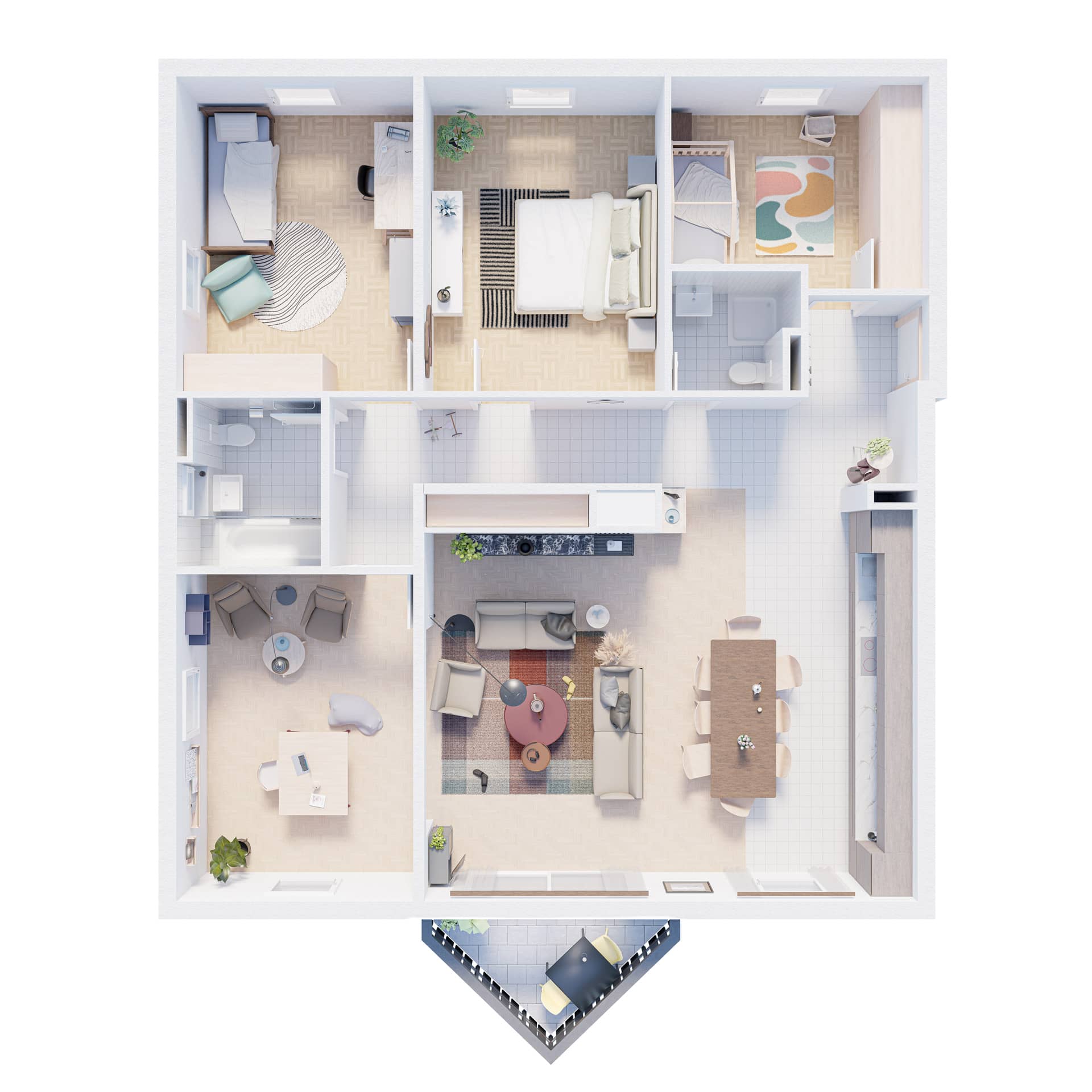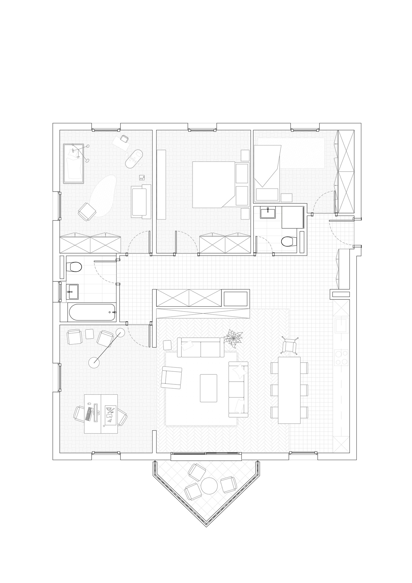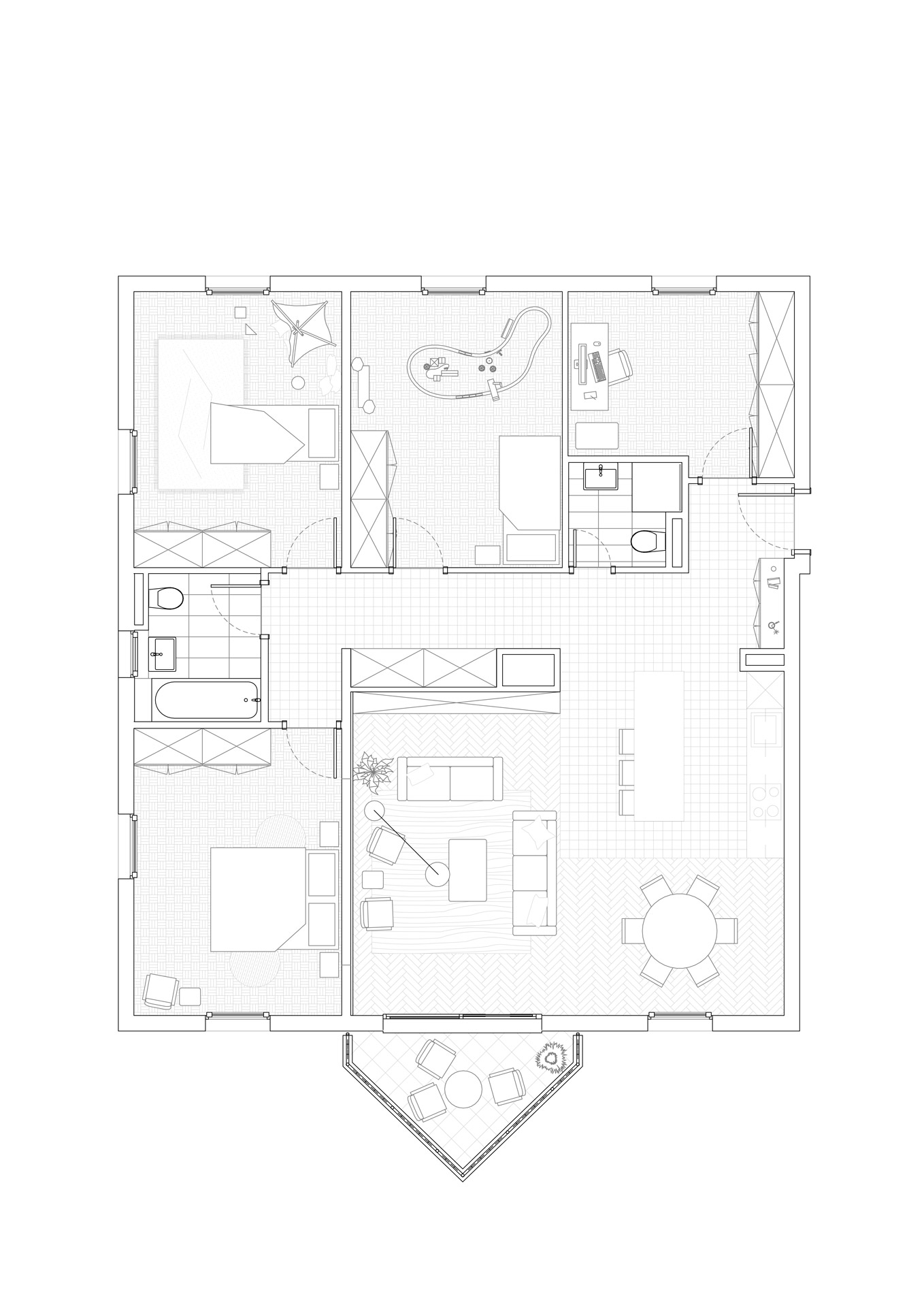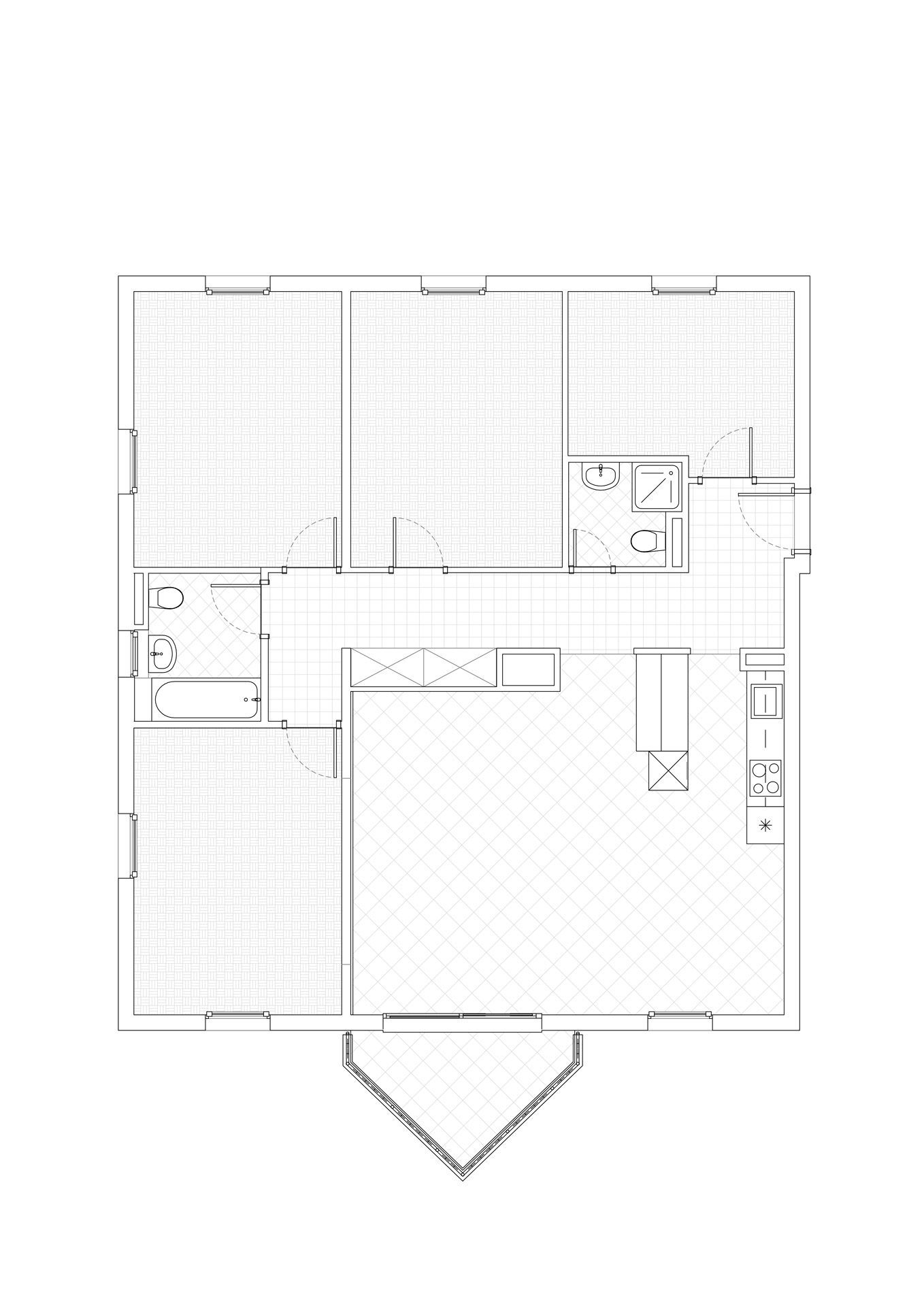 Situé au premier étage d’un immeuble datant de 1995, cet appartement de 5,5 pièces bénéficie de trois orientations et d’un balcon à l’ouest. Le projet explore deux variantes de rénovation visant à accroître son attractivité sur le marché immobilier. La variante 01 propose une ouverture de la cuisine sur l’espace de vie, une modernisation des revêtements (parquet rénové, sol différencié pour cuisine et circulation), ainsi qu’une mise à jour des salles de bains. Un travail de rafraîchissement général est prévu sur les menuiseries intérieures. La variante 02 conserve les principes de la première tout en intégrant la suppression d’une cloison non porteuse pour agrandir le séjour. Elle propose un espace polyvalent pouvant faire office de bureau, coin TV ou aire de jeux, renforçant ainsi la flexibilité et la valeur d’usage du bien.