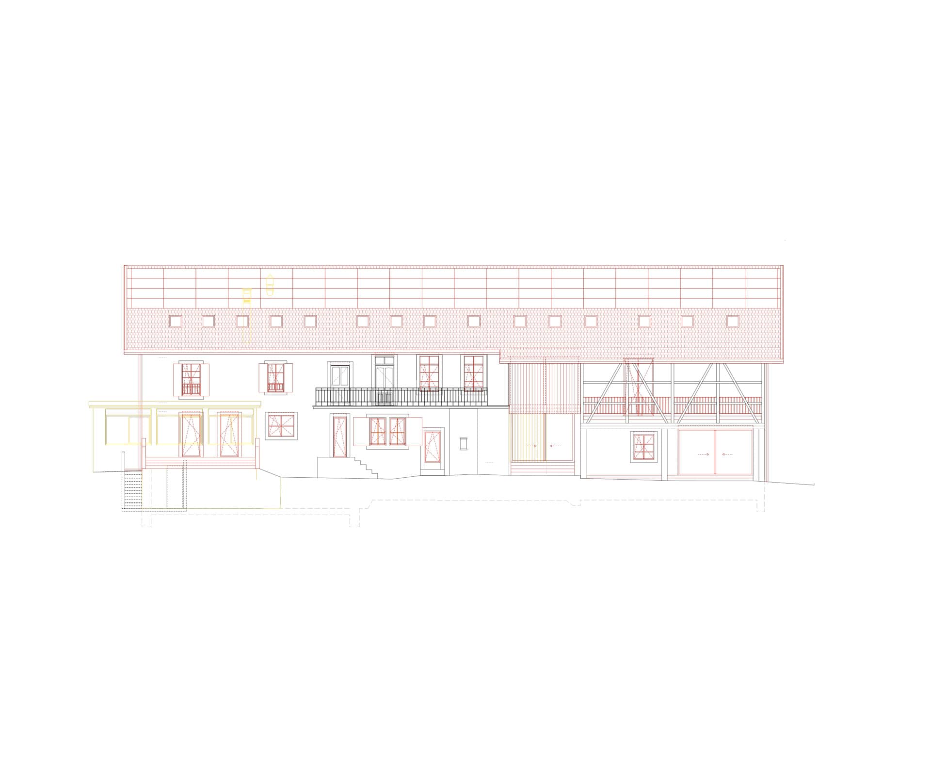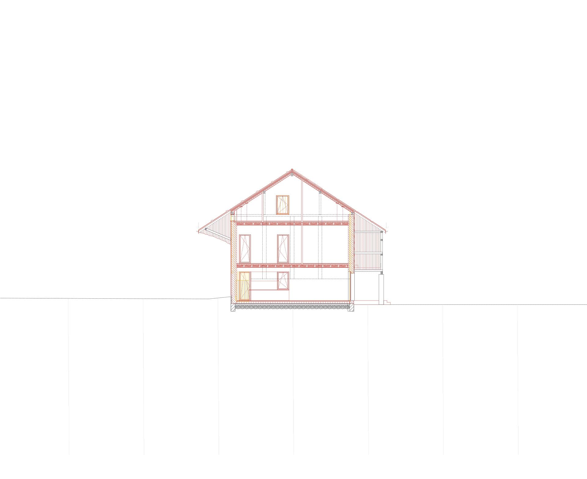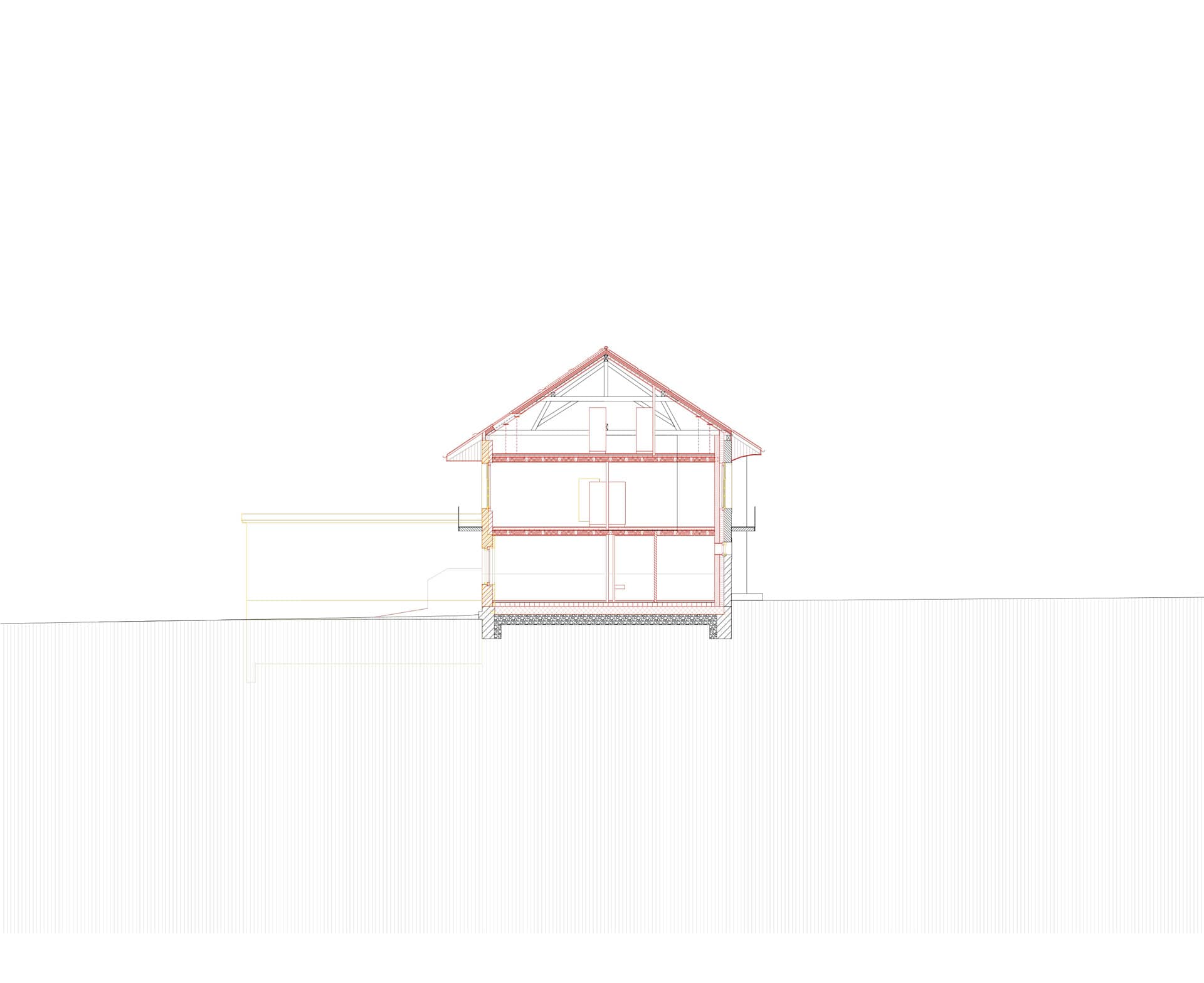 Ce projet concerne le changement d’affectation et la transformation intérieure du Relai du Lion-d’Or, une ancienne auberge datant du dernier quart du XIXe siècle. Le bâtiment principal et son bûcher seront reconvertis en trois habitations mitoyennes. L’annexe moderne à toiture plate sera démolie, afin de restituer la cohérence architecturale d’origine de l’ensemble. L’organisation intérieure respecte la trame spatiale historique, tout en adaptant les typologies aux usages actuels. Les nouvelles structures intérieures s’intègrent avec cohérence, en ossature bois ou brique pour les éléments verticaux, et dalles mixtes pour les planchers. Les interventions extérieures sont limitées et sensibles : les percements sont majoritairement conservés, les fenêtres reprennent le langage d’origine (menuiseries brun bois à petits bois), et les éléments techniques (panneaux solaires) sont dissimulés sur la toiture côté jardin. Chaque lot dispose d’un jardin privatif et de places de stationnement, intégrées discrètement dans le site. Le portail de la grange est conservé en l’état et devient un filtre visuel pour préserver l’intimité.