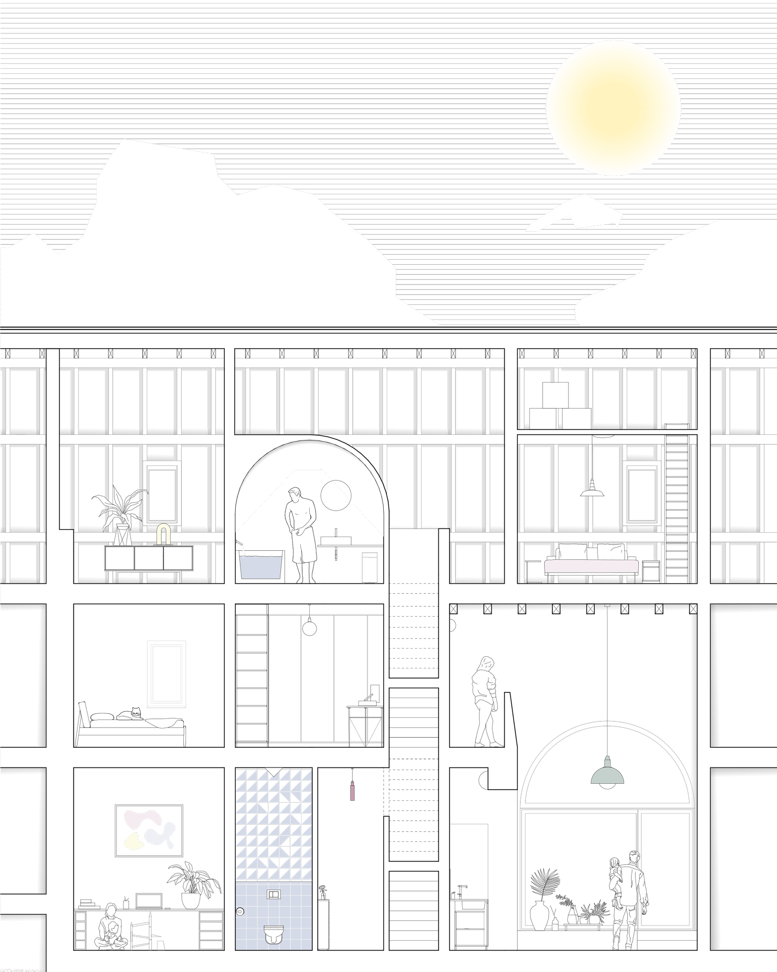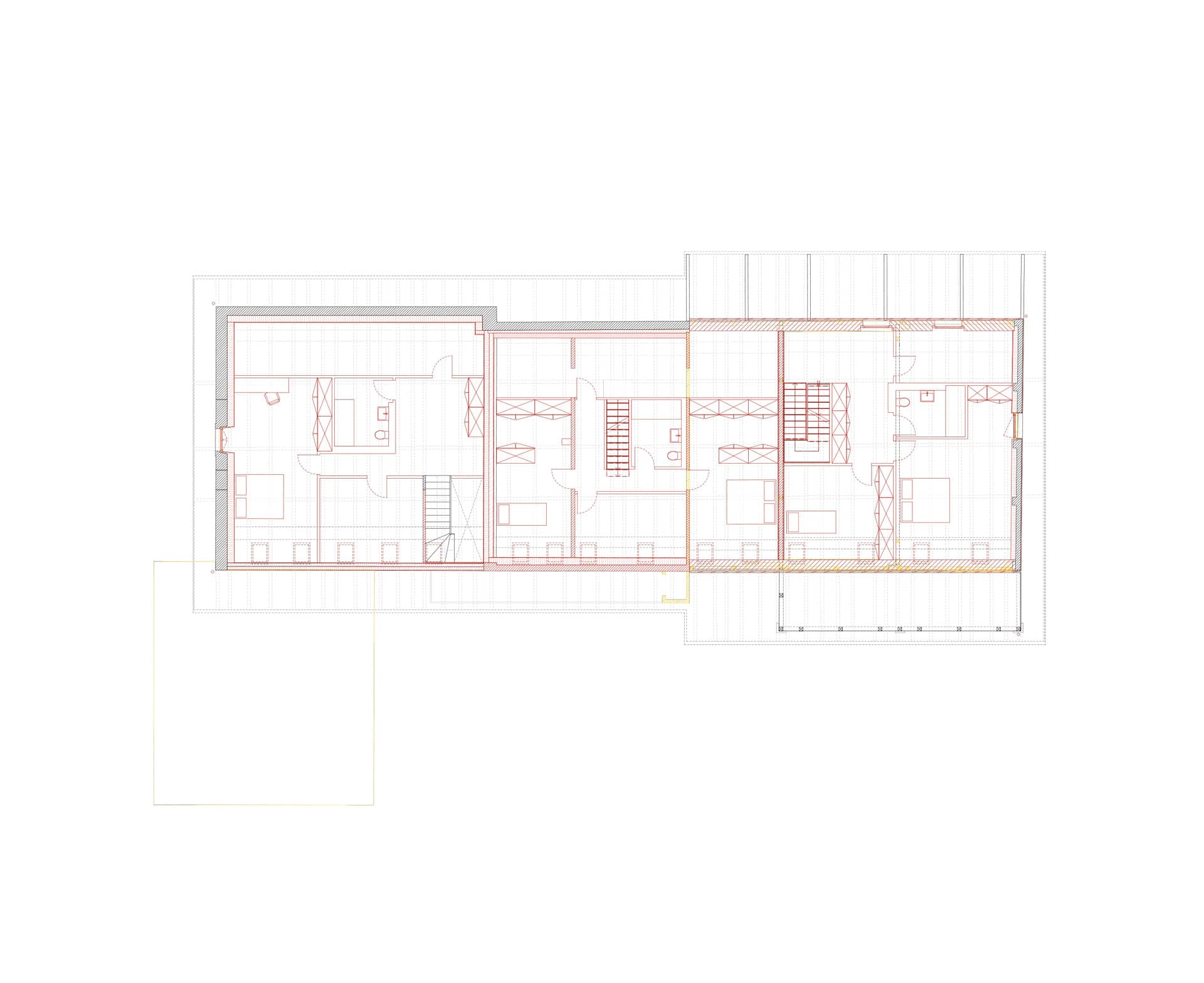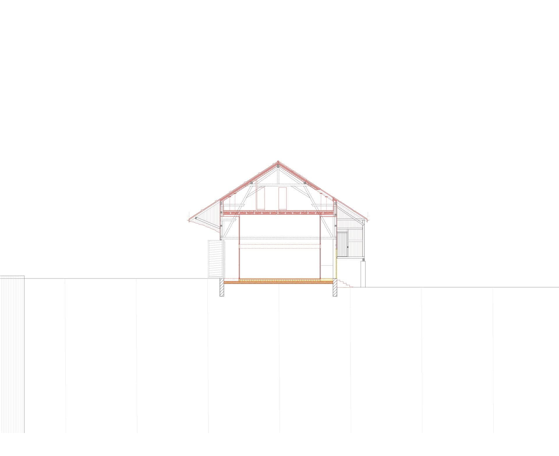 Ce projet concerne le changement d’affectation et la transformation intérieure du Relai du Lion-d’Or, une ancienne auberge datant du dernier quart du XIXe siècle. Le bâtiment principal et son bûcher seront reconvertis en trois habitations mitoyennes. L’annexe moderne à toiture plate sera démolie, afin de restituer la cohérence architecturale d’origine de l’ensemble. L’organisation intérieure respecte la trame spatiale historique, tout en adaptant les typologies aux usages actuels. Les nouvelles structures intérieures s’intègrent avec cohérence, en ossature bois ou brique pour les éléments verticaux, et dalles mixtes pour les planchers. Les interventions extérieures sont limitées et sensibles : les percements sont majoritairement conservés, les fenêtres reprennent le langage d’origine (menuiseries brun bois à petits bois), et les éléments techniques (panneaux solaires) sont dissimulés sur la toiture côté jardin. Chaque lot dispose d’un jardin privatif et de places de stationnement, intégrées discrètement dans le site. Le portail de la grange est conservé en l’état et devient un filtre visuel pour préserver l’intimité.